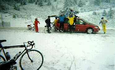 For 25 miles, we wound through Grand Junction and its outskirts, going up and down rolling hills as we continued on our way northwest. After the first rest stop, we turned north for a steady 21-mile climb to Douglas Pass. With each passing mile as we headed toward the summit, the temperature dropped. Soon we noticed bits of snow on our gloves and bikes as we ground up the steepening grade. These bits eventually got thicker and the road became slush-covered in places.