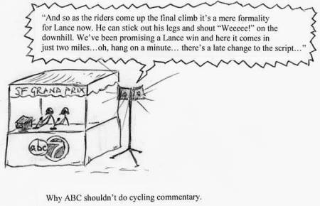 In September, Wannabe is lucky enough to catch the 2nd San Francisco Grand Prix circuit race. The course is made marginally easier than last year’s inaugural event - just eight times over the Fillmore Street hill instead of ten – but the quality of the teams is significantly increased and the faster pace more than compensates. Stars of the show again are Sir Lance Armstrong and last year’s winner, George Hincapie, ably assisted this year by Vladislav Ekimov and seven other Posties. Other big teams to show include 2nd tier members of Acqua & Sapone, Saeco and all the names of the big domestic teams such as Saturn and Navigators. Last year a meagre 28 finished of 140-odd starters. The stronger field this year means that there are still 51 riders on the last lap when Sir Lance and Ekimov get into a break with Henk Vogels, Harm Jansen, Chris Horner and half a dozen guys you’ve never heard of. The crowd is fully expecting a massive Lance attack up the final hill: Taylor Street. The atmosphere is tense, everyone who isn’t immediately related to another rider having been whipped into a pro-Lance frenzy by some pantomime-esque commentary from an ABC Sports team more accustomed to football. Lance (“Hurrah!”) seems to be cruising, one hand on the bars and the other on the radio to his directeur sportif, Frankie Andreau. As the riders reach the summit of Taylor the group is still together. The atmosphere grows more tense. What now? Surely Sir Lance (“Hurrah!”) will attack and see if he can stay away for the final two miles? It’s obvious! If the attack fails there will be Eki (“Boo.”) sitting on ready for the final sprint. Recall those half a dozen guys you’ve never heard of? Seems they hadn’t read the script. Coming into the final straight there are nine guys in the group and everyone’s jockeying for the sprint. Henk Vogels (“Boo! Hiss!”) hits the front with a couple of hundred metres to go and by now it’s clear the Posties are not going to feature. Eki does his best trying to hang on to Henk’s wheel but the younger guys are too fast. Henk’s flying but not as fast as Canadian youngster Charlie Dionne on 7UP/NutraFig, who blasts past Henk for the win by a bike length. Eki gets fourth and Lance rolls through in 6th.