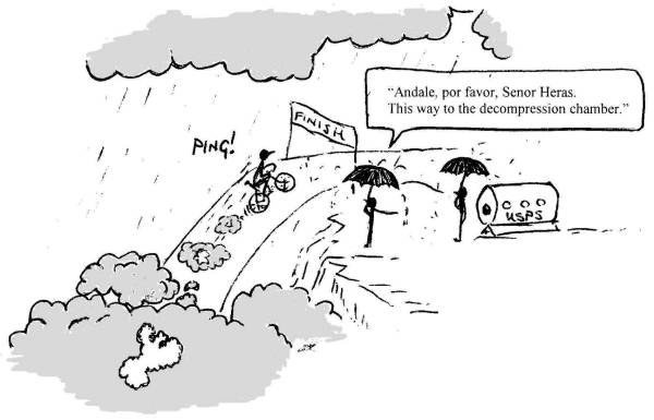 Ascending like a helium-filled balloon is one thing but a 41 km flat time trial requires a different physiology entirely. Roberto has a 1 min 8 sec lead going into the final stage and all the pundits are expecting a close finish. Gonzalez and Sevilla, in 2nd and 3rd, respectively, are the much better time trialists. Roberto can’t afford to lose much more than a second a kilometre to the Kelme boys. Nailbiting stuff…! In the event all the anticipation is sadly misplaced, however. It’s clear within the first 10 km that Roberto’s legs just don’t want to pedal any more and he loses almost 5 seconds a kilometre to Gonzalez by the end of the stage. Roberto is fortunate to get a podium spot, finishing 2nd overall, after Sevilla has two mechanical problems that require bike swaps and cost him all sorts of time. This allows Joseba Beloki to capture 3rd place overall by 15 seconds from Sevilla, 57 seconds behind Heras.